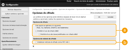 Configure los ajustes de cifrado y el método de cifrado, y haga clic en [Aceptar].