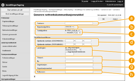 | | Maskinen kan generere nøkkel og sertifikat (serversertifikat) som brukes for TLS-kryptert kommunikasjon. Hvis du vil begynne å bruke TLS-kryptert kommunikasjon umiddelbart, er det praktisk å bruke nøkkelen og sertifikatet som er forhåndsinstallert på maskinen. Spør, om nødvendig, en administrator om å generere en nøkkel og et sertifikat. Vær imidlertid oppmerksom på at TLS-kryptert kommunikasjon ikke aktiveres bare ved å generere en nøkkel og et sertifikat. Konfigurere nøkkel og sertifikat for TLS |