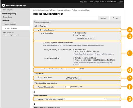 ![]() | For å angi en Active Directory- eller LDAP-server som en ekstra godkjenningsenhet, må du registrere informasjonen til serveren som brukes til godkjenning. Utfør en tilkoblingstest ved behov. |