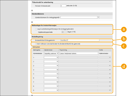 [Tegnstreng] | Skriv inn tegnstrenger som er registrert for attributtet angitt i [Brukerattributt å bla gjennom:]. Hvis du vil angi rettighetene basert på gruppen som brukeren tilhører, skriver du inn gruppenavnet. |
