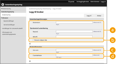 Se etter uregistrerte avdelings-ID-erHvis du klikker på [Sjekk uregistrert avdelings-ID...] på skjermen vist i trinn 4, kan du finne ut avdelings-ID-er som ikke er registrert i maskinen, ved å sjekke avdelings-ID-er tilordnet brukerne mot avdelings-ID-er registrert i maskinen. Batch-innstillinger for avdelings-ID-erHvis du klikker på [Batch-innstillinger for avdelings-ID...] på skjermen vist i trinn 4, kan du opprette nye avdelings-ID-er og bruke innstillinger for alle brukere. Hvis brukernavnet består av tall og er sju sifre eller færre, tilordnes det samme nummeret til den samme brukeren som avdelings-ID-en. Hvis passordet til den samme brukeren er registrert som et nummer som er sju sifre eller færre, angis det også som PIN-koden for den avdelings-ID-en. Hvis brukernavnet og passordet ikke oppfyller betingelsene ovenfor, tilordnes en avdelings-ID automatisk. ID-en starter fra 0000001, og 0 (ingen) angis for PIN-koden. Registrere avdelings-ID-en som brukernavnetHvis du klikker på [Legg til bruker ved bruk av avdelings-ID...] på skjermen vist i trinn 4, registreres en ny bruker med det samme navnet som avdelings-ID-en. Når tastaturgodkjenning brukes, kan godkjenning kun utføres med talltastene. |