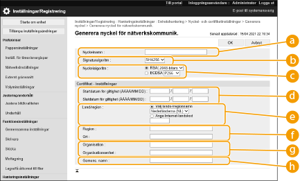 Om [SHA384] eller [SHA512] är valt för [Signaturalgoritm] kan nyckellängden inte ställas in på [512-bit.] när [RSA] är valt för [Nyckelalgoritm].