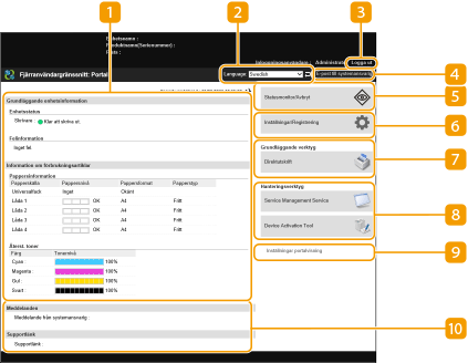 Portalsidan visas nedan när du loggar in till Remote UI (Fjärranvändargränssnittet). I det här avsnittet beskrivs de alternativ som visas på portalsidan och de grundläggande åtgärderna.