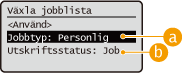 <Jobb att skriva ut>/<Utskrivna jobb>
