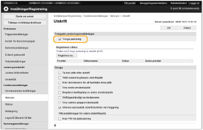 Följande jobb skrivs inte ut automatiskt ens om den här inställningen är aktiverad. <Personlig> jobb för andra användare och <Delad> jobb Utskrivna jobb Krypterade säkra utskriftsjobb |