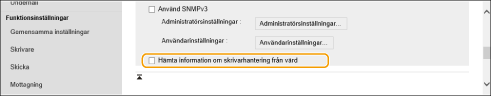 Markera kryssrutan för att aktivera övervakning av skrivarhanteringsinformation för maskinen via SNMP. Om du vill inaktivera övervakning av skrivarhanteringsinformation avmarkerar du kryssrutan.