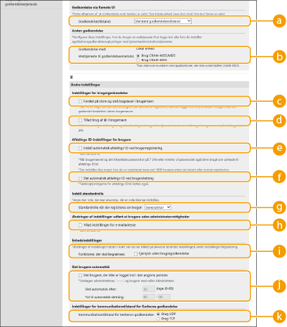 Vælg godkendelsesstatussen, der skal anvendes ved Remote UI (Brugerinterface til fjernbetjening)-login. Når [Gæstegodkendelsestilstand] er valgt, kan ikke-registrerede brugere også logge ind ved at klikke på [Logindestination: ]. Vælg [Administratorgodkendelsestilstand] for at tillade, at kun brugere med administratorrettigheder kan logge ind.
