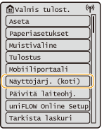 Valitse <Näyttöjärj. (koti)>, jos haluat mukauttaa <Päävalikko>-näkymää järjestämällä painikkeet uudelleen. Näytön mukauttaminenVoit muuttaa näyttöön liittyviä asetuksia, esim. mikä näyttö avautuu heti laitteen käynnistyttyä, ja näytetäänkö jäljellä olevaa paperin ja väriaineen määrää koskeva viesti. <Näyttöasetukset> |