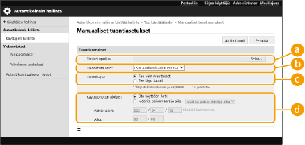 Voit määrittää tuotavat tiedot ja päivittää käyttäjätiedot manuaalisesti.