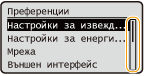 Можете да промените различни настройки, свързани с дисплея, като например езика на дисплея: <Настройки за извеждане> Можете да промените екрана, който се показва автоматично, когато машината остава в бездействие за определен период от време: <Функция след авт. нулиране> Можете да промените различни настройки, свързани с достъпността, като например скоростта на превъртане: <Достъпност> |