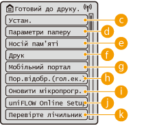 Відображаються рівні тонера в картриджах. Вони не відображаються, коли використовується екран <Головний>.