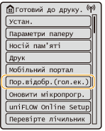 Ви можете змінити параметри дисплея, наприклад указати, який екран відображається відразу після ВВІМКНЕННЯ апарата, а також чи відображається повідомлення про залишок паперу та тонера. <Параметри відображення> |