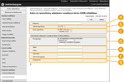 A készüléken előállított tanúsítványok nincsenek CA aláírással ellátva, ami egyes kommunikációs partnerek esetében kommunikációs hibákat okozhat. CA aláírással ellátott tanúsítvány igényléséhez tanúsítvány-aláírási kéréshez (CSR) kapcsolódó adatok szükségesek. CSR-t rendszergazdai jogosultságokkal bejelentkező felhasználók állíthatnak elő.