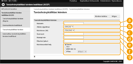 A készülékkel előállított kulcsokhoz szükséges tanúsítvány kibocsátására vonatkozó kérelmet lehet küldeni egy tanúsítványokat kezelő SCEP- (Simple Certificate Enrollment Protocol, egyszerű tanúsítványigénylési protokoll) kiszolgálónak. Az SCEP-kiszolgáló által kibocsátott tanúsítványokat a készülék automatikusan bejegyzi. Tanúsítvány kibocsátására vonatkozó kérelem küldéséhez Administrator jogosultságok szükségesek.