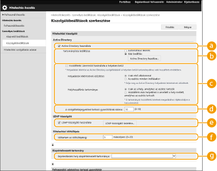 ![]() | Ha kiegészítő hitelesítő eszközként Active Directory- vagy LDAP-szervert szeretne megadni, akkor be kell jegyeznie a hitelesítéshez használt kiszolgáló adatait. Szükség szerint tesztelje a kapcsolatot. |