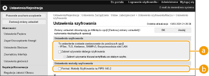 W przypadku wybrania opcji [Format. Metody Szyfrowania na FIPS 140-2] można zapewnić zgodność metody szyfrowania komunikacji TLS z normami FIPS 140-2 (Federalne standardy przetwarzania informacji) zatwierdzonymi przez rząd USA, jednak przy następujących ograniczeniach. Po określeniu certyfikatu dla TLS, w którym używany jest algorytm nierozpoznawany przez FIPS (niższy niż RSA2048bit), wystąpi błąd. Jeśli miejsce docelowe komunikacji nie obsługuje algorytmów szyfrowania uznawanych przez FIPS, wystąpi błąd komunikacji. Nie ma już możliwości użycia opcji [CHACHA20-POLY1305] i [X25519]. Importowanie wsadowe/eksportowanie wsadoweTo ustawienie można zaimportować/wyeksportować w przypadku tych modeli, które obsługują funkcję grupowego importowania tego ustawienia. Importowanie/eksportowanie danych ustawień To ustawienie jest dostępne w pozycji [Podstawowe informacje o ustawieniach/rejestracji] podczas eksportu wsadowego. Import/eksport wszystkich ustawień |