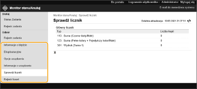 Możesz sprawdzić szereg informacji na temat urządzenia, na przykład informacje o błędach, ilość pozostałego papieru i tonera, informacje na temat dołączonego wyposażenia opcjonalnego oraz całkowitą ilość wydrukowanych stron.