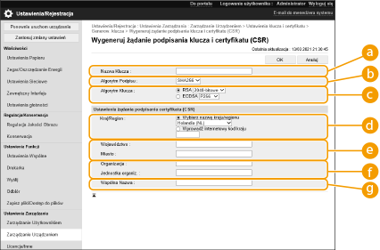 Certyfikaty wygenerowane za pomocą tego urządzenia nie posiadają podpisu CA, co może skutkować błędami komunikacji z niektórymi urządzeniami. Aby żądać certyfikatu z podpisem CA, niezbędne są dane żądania podpisania certyfikatu (CSR). Wyłącznie administratorzy mogą generować CSR.