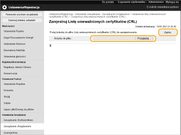 Możesz skorzystać z interfejsu Remote UI (Zdalny interfejs użytkownika), aby zarejestrować listę unieważnionych certyfikatów (CRL). Aby uzyskać więcej informacji na temat list CRL, które można zarejestrować w urządzeniu, patrz