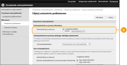 Wybierz tryb uwierzytelniania do wykorzystywania wraz z interfejsem Remote UI (Zdalny interfejs użytkownika). Jeżeli wybierzesz [Tryb uwierzytelniania gościa], niezarejestrowani użytkownicy mogą się również logować po naciśnięciu na [Miejsce docelowe logowania:]. Wybierz [Tryb uwierzytelniania administratora], aby umożliwić logowanie wyłącznie administratorom.
