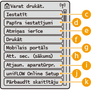 Izmantojot šo pogu, var piekļūt daudziem iekārtas iestatījumiem, piemēram, <Funkciju iestatījumi> un <Preferences>.