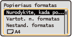 Jei dažnai reikia keisti įdedamo popieriaus formatą, nustatykite <Nestand. formatas>; taip sumažinsite kaskart keičiant parametrą atliekamų veiksmų skaičių. Be to, jeigu spausdintuvo tvarkyklėje nurodytas visiškai kitokio formato popierius, negu įdėtasis, gali būti rodomas klaidos pranešimas.