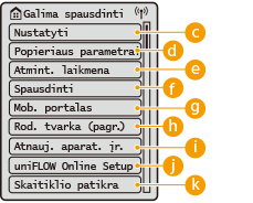 <Funkcijos parametrai>, <Nuostatos> ir dar daug aparato parametrų, kuriuos galima pasiekti paspaudus šį mygtuką.