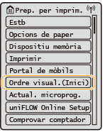 Podeu canviar les opcions corresponents a la visualització de la pantalla, com ara la pantalla que apareix immediatament després d'engegar l'equip i si apareix el missatge de paper tòner i restant. <Opcions de visualització> |