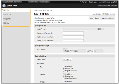 Si s'estableix una contrasenya per al fitxer PDF, premeu [Specify PDF File]  introduïu la contrasenya a [Document Password]. Quan imprimiu fitxers PDF vinculats al servidor de polítiques, seleccioneu [Specify PDF File] introduïu el nom d'usuari del servidor de polítiques a [Policy Server User Name] i la contrasenya corresponent a [Policy Server Password].