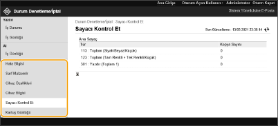 Hata bilgileri, kalan kağıt ve toner miktarı, takılı isteğe bağlı ekipmanlarla ilgili bilgi ve şimdiye kadar yazdırılan toplam sayfa sayısı gibi makine hakkındaki çeşitli bilgileri denetleyebilirsiniz.