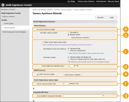 ![]() | Bir Aktif Dizin veya LDAP sunucusunu ilave kimlik doğrulama cihazı olarak belirtmek için, kimlik doğrulaması için kullanılan sunucunun bilgilerini kaydetmeniz gerekir. Gerektiği şekilde bir bağlantı testi gerçekleştirin. |