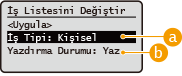 <İş Tipi> ve <Yazdırma Durumu> alanlarını (<İş Listesini Değiştir> ekranı) seçin.