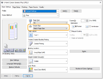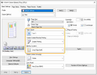 3 | בעת בדיקת התצוגה המקדימה של ההדפסה, הגדר את [Page Layout] [Page Order] [1-sided/2-sided/Booklet Printing] [Binding Location].![]() |