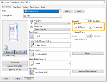 2 | במסך [Basic Settings] של מנהל המדפסת, הגדר את [Orientation] לאותו כיוון שהגדרת בשלב 1. ![]() |