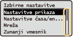 Spremenite lahko različne nastavitve zaslona, na primer jezik uporabniškega vmesnika: <Nastavitve prikaza>Spremenite lahko različne nastavitve dostopnosti, na primer hitrost pomikanja: <Dostopnost> |