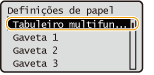 Depois que a definição de papel padrão é registrada, a tela de definição não é exibida quando o papel é carregado e a mesma definição é sempre usada. Se você carregar um tamanho ou um tipo de papel diferente sem mudar as definições, a máquina poderá não imprimir corretamente. Para evitar esse problema, selecione <Especificar ao Colocar Papel> na etapa 3 e carregue o papel. |
