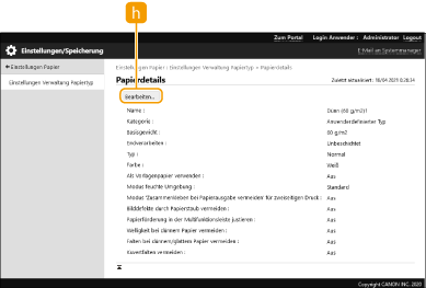 [Bearbeiten]Wird am Bildschirm [Papierdetails] für den anwenderdefinierten Typ eingeblendet und ermöglicht die Änderung der Einstellungen für das ausgewählte Element.