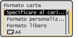 Se è necessario cambiare frequentemente la carta da caricare, impostare su <Formato libero>; ciò ridurrà il numero di passaggi necessari per modificare l’impostazione ogni volta. È inoltre possibile visualizzare un messaggio di errore quando l’impostazione nel driver della stampante è notevolmente diversa dal formato della carta caricata.