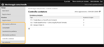 È possibile verificare un gran numero di informazioni sulla macchina, ad esempio informazioni sugli errori, quantità di carta e toner rimanenti, informazioni sulle apparecchiature opzionali collegate e numero totale di pagine che sono state stampate finora.