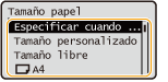 Si necesita cambiar frecuentemente el papel que se va a cargar, ajuste en <Tamaño libre>; esto reducirá el número de pasos necesarios para cambiar el ajuste. También puede visualizar un mensaje de error cuando la configuración del controlador de la impresora sea significativamente diferente al tamaño del papel cargado.