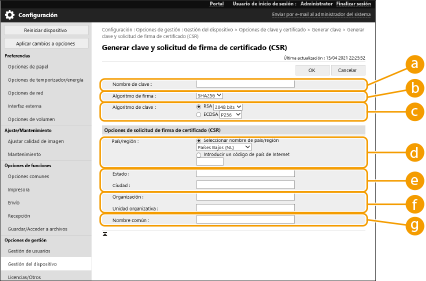 [Algoritmo de clave]Seleccione el algoritmo de clave y especifique la longitud de la clave si se selecciona [RSA], o bien especifique el tipo de clave si se selecciona [ECDSA].