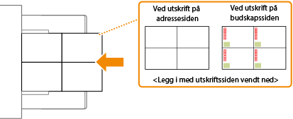 Denne delen beskriver hvordan du legger i postkort i riktig retning, samt prosedyrene som du må utføre før du legger i postkort. For en beskrivelse av den generelle prosedyren for å legge postkort i multibrettet, kan du se Grunnleggende metode for innlegging av papir. |