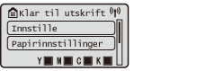 (Hjem). <Hjem>-skjermbildet eller innstillingsskjermbildet vises på skjermen, slik at du kan starte funksjoner som <Minnemedia> og <Mobilportal>. Du kan også bruke skjermen til å sjekke informasjon som feilmeldinger og maskinens driftsstatus.