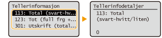 Du kan kontrollere separate totaler for antall sider som brukes til fargeutskrifter og svart/hvitt-utskrifter. Antall utskrifter inkluderer utskrifter av minnemedieutskrifter og listen, samt utskrift av data fra datamaskiner.