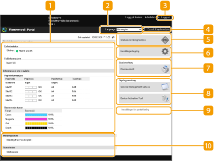Portalsiden som vises nedenfor, vises når du logger inn på Fjernkontroll. Denne delen beskriver elementene som vises på portalsiden og de grunnleggende handlingene.
