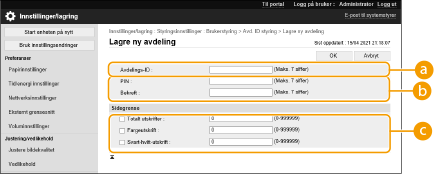 Avdelings-ID-styring er kun gyldig for brukere som er registrerte på den lokale enheten. Hvis du logger deg inn som en bruker med administratorprivilegier, tilordnes en systemstyrer-ID og PIN-kode automatisk og administreres som avdelings-ID. |