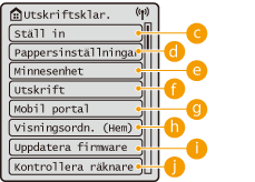 <Funktionsinställningar>, <Preferenser> och många andra maskininställningar startar från denna knapp.