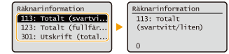 Du kan kontrollera olika totalsummor för det antal sidor som används för färgutskrifter och svartvita utskrifter. Antalet utskrifter inkluderar utskrifter av minnesenhetsutskrift och listan samt utskrifter av data från datorer.
