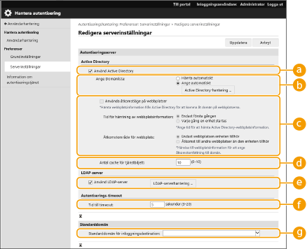 ![]() | För att ange en Active Directory- eller en LDAP-server som en ytterligare autentiseringsenhet, måste du registrera informationen för den server som används för autentisering. Utför ett anslutningstest efter behov. |