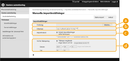 Om du väljer [Utför full import] och en användare med samma användarnamn redan har registrerats, skrivs användarinformationen över.
